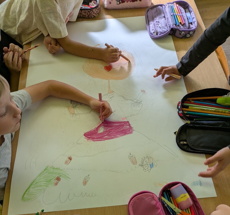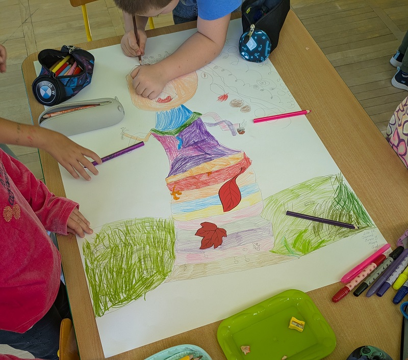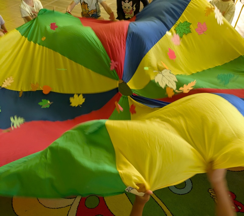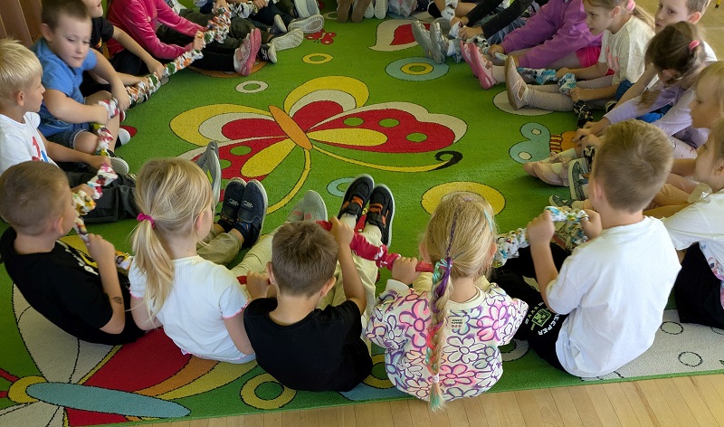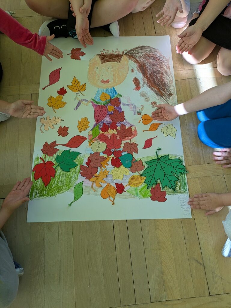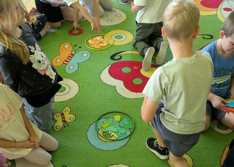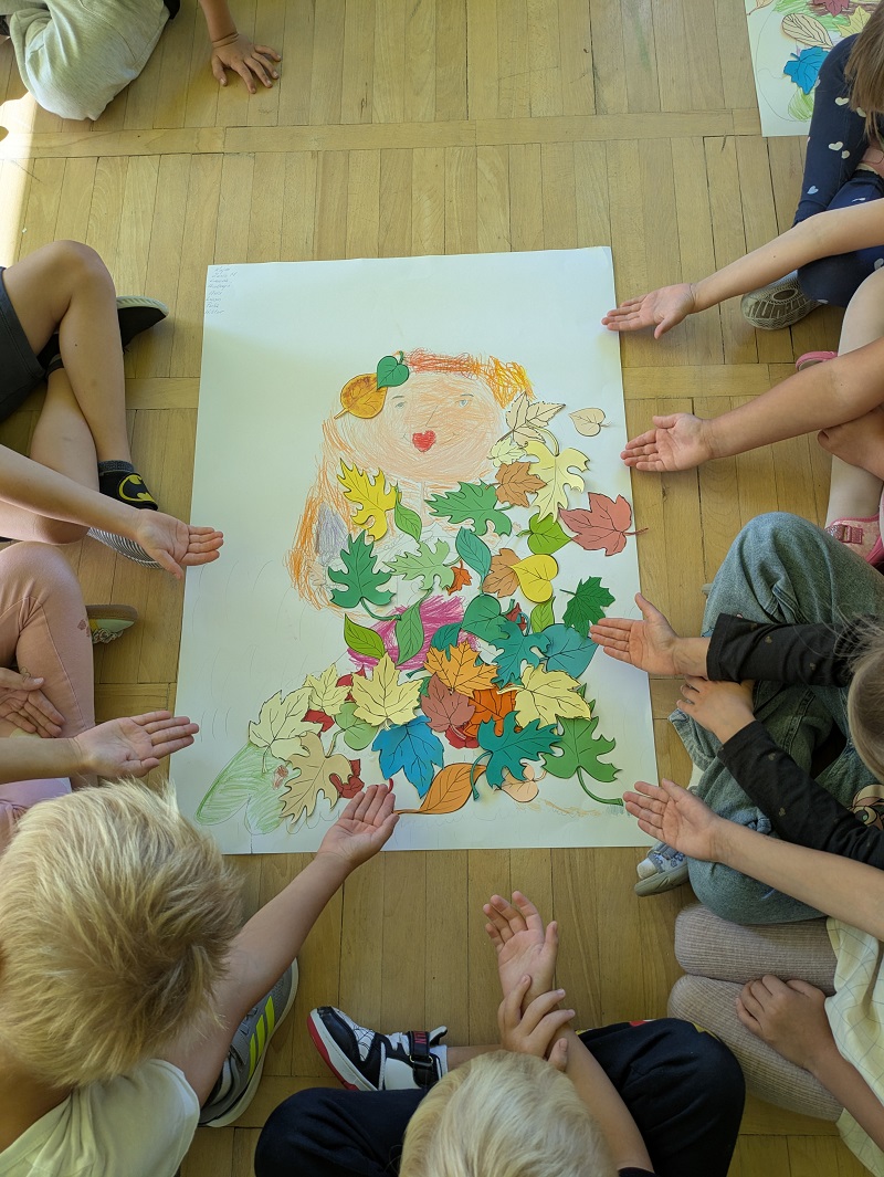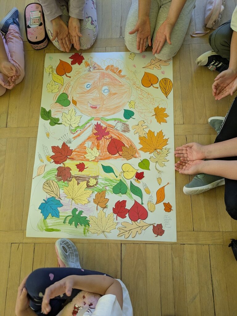 Dzieci z grupy IV „Motylki” radośnie powitały nową porę roku. Brały udział w zabawach z chustą animacyjną, bawiły się z gumą sensoryczną przy muzyce poważnej, śpiewały jesienne piosenki, segregowały dary przyrody, a na zakończenie w grupach stworzyły kolorowe portrety Pani Jesieni.