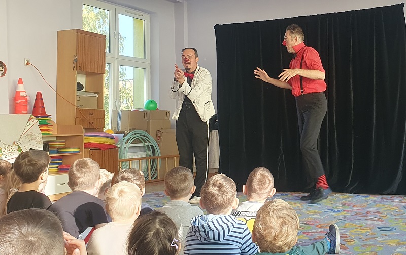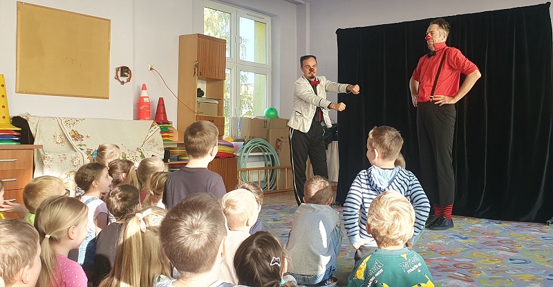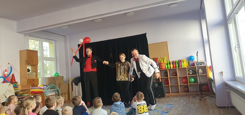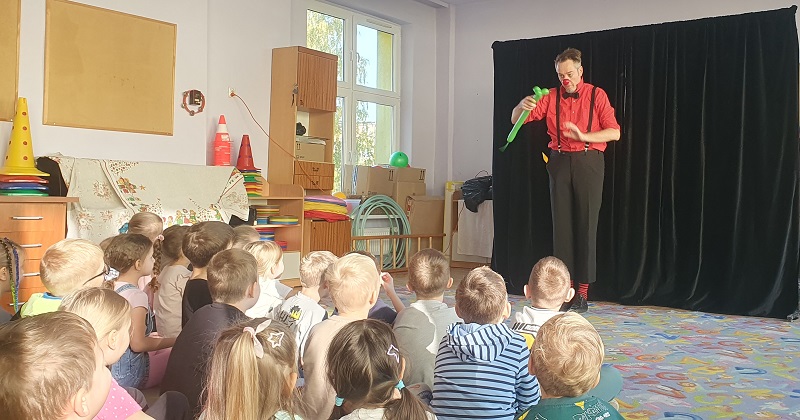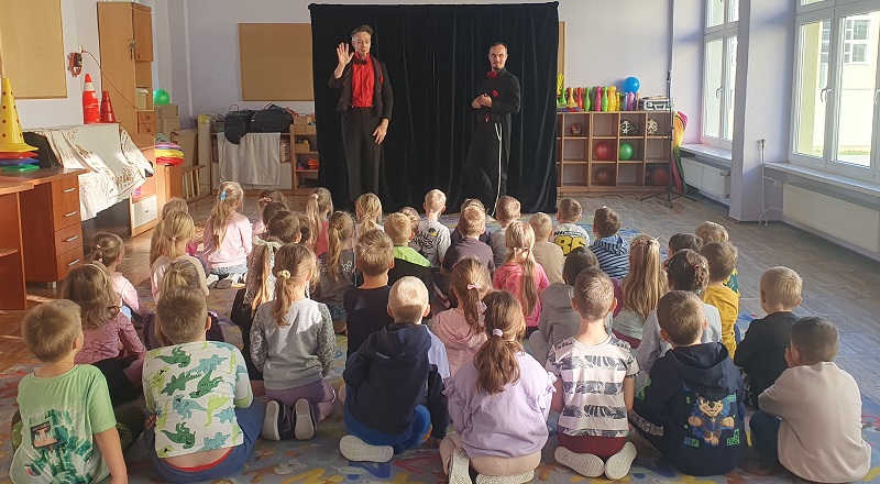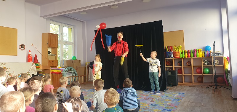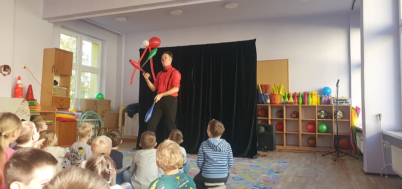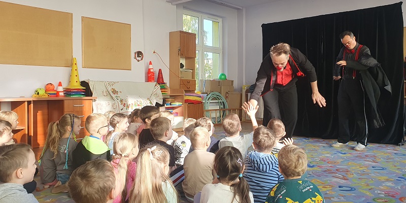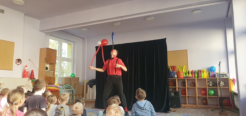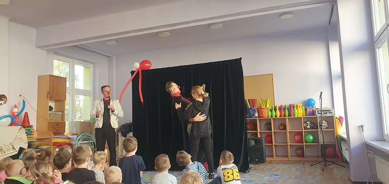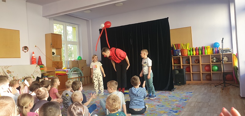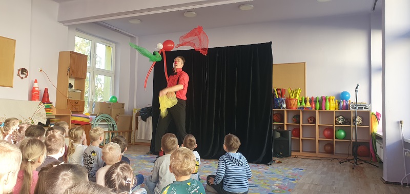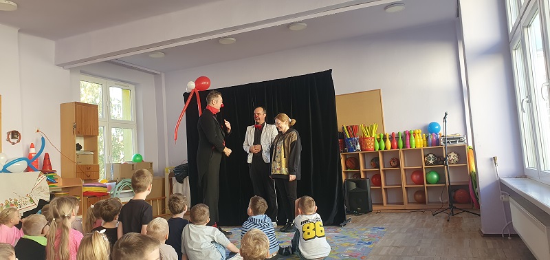W dniu 20.10.2025 r. (poniedziałek) odwiedził nasze przedszkole „Teatr na walizkach”. Są to artyści z Wrocławia, którzy przedstawili nam sztukę pt. „Big smile” w języku angielskim, w której też czynny udział brała nasza publiczność, Która była oczarowana. Artyści połączyli w przedstawieniu komedię, pantomimę, teatr i najważniejsze, było duuuużo energii, śmiechu i radości.