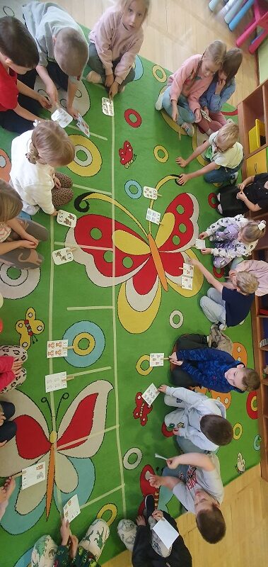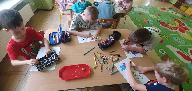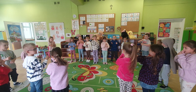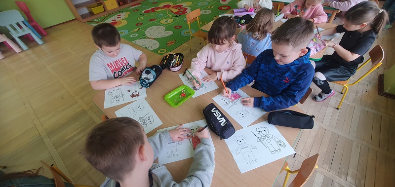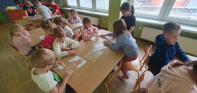Po powrocie do sali zatańczyły do piosenki „Ja jestem Niedźwiadek”, poznały historię powstania pierwszego pluszowego misia, była „Misiowa matematyka” i zabawa z misiami w orientacji przestrzennej. Następnie w zespołach kilku osobowych ułożyły puzzle, a na koniec każdy pokolorował swojego Misia Uszatka.