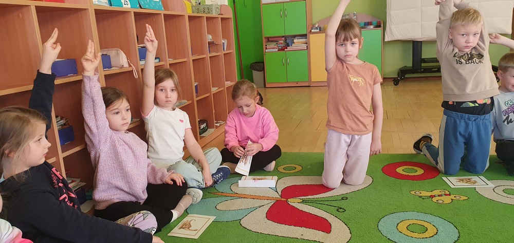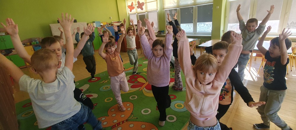 Następnie dzieci wzięły udział w zabawie ruchowo-naśladowczej pt. „Dinozaury”, podczas której naśladowały sposób poruszania się i zachowania różnych dinozaurów. Była to doskonała okazja do aktywności ruchowej oraz świetnej zabawy. W trakcie zajęć odbyła się także gimnastyka buzi i języka, a także całego ciała – dzieci ćwiczyły, naśladując odgłosy i ruchy dinozaurów.