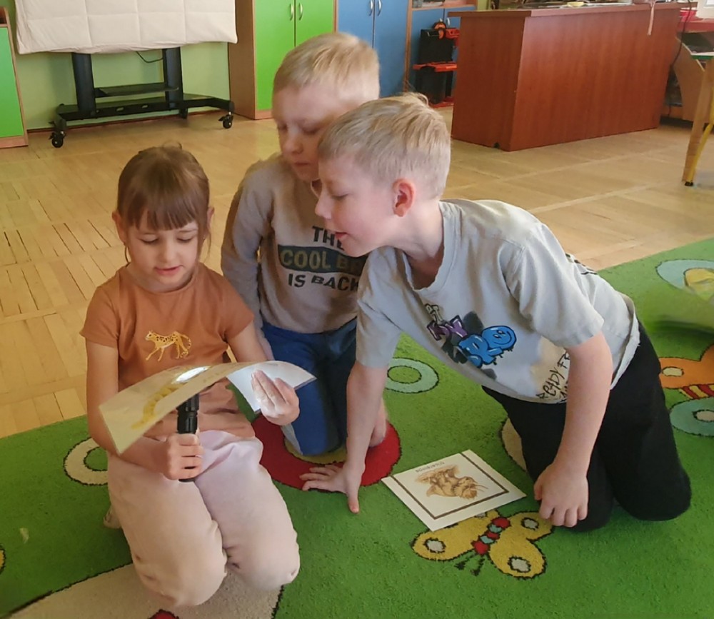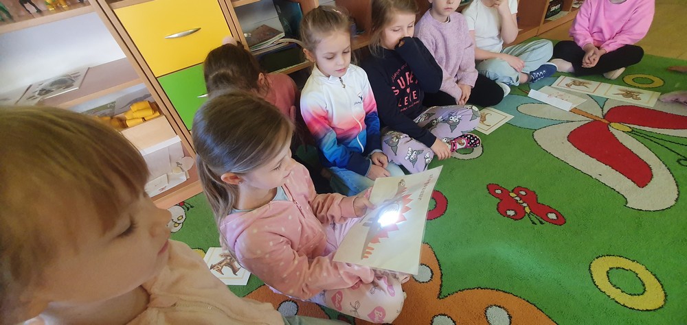 Kolejną atrakcją było odkrywanie, co jadły dinozaury. Za pomocą latarek przedszkolaki sprawdzały ukryte ilustracje i odgadywały, które z nich były roślinożerne, a które mięsożerne.
