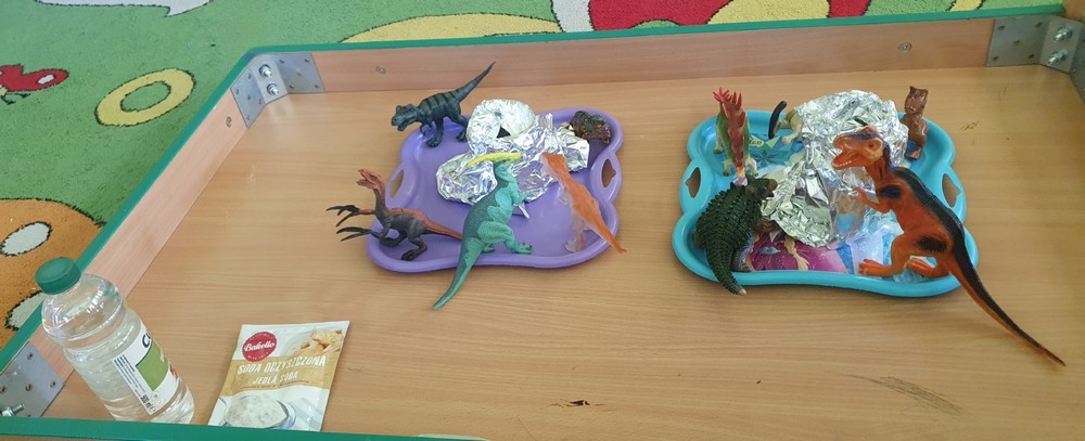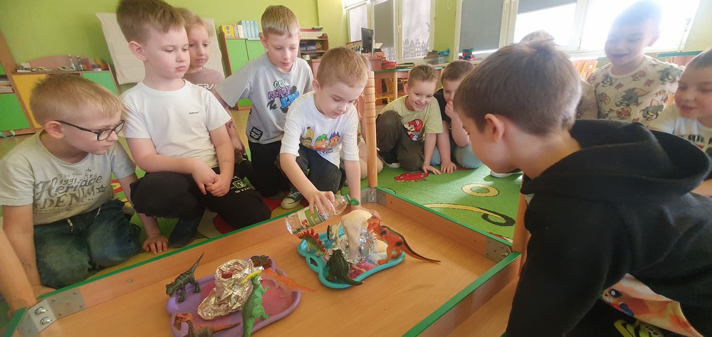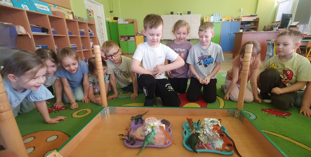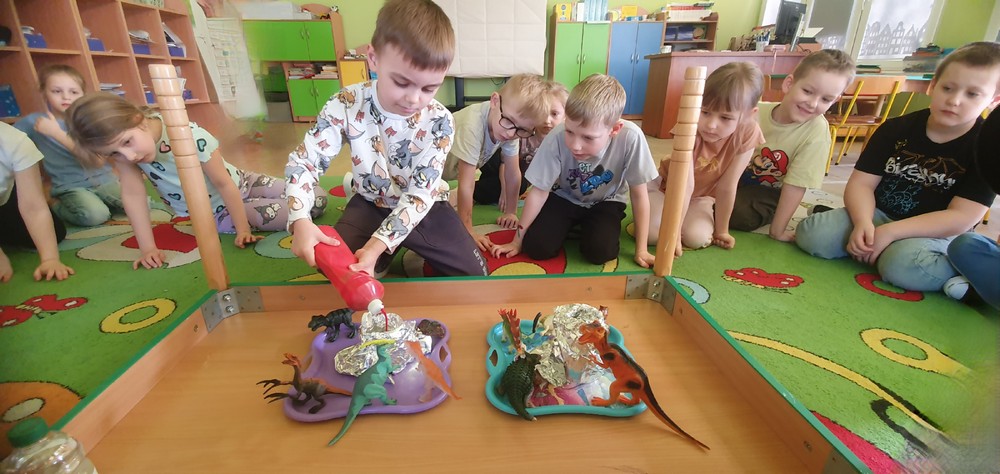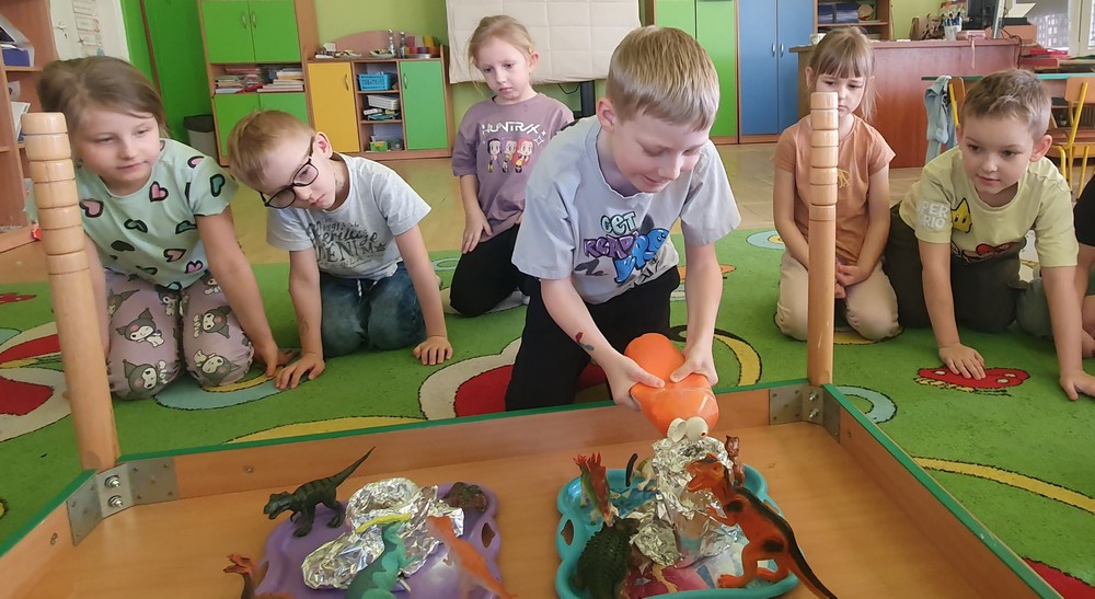 Dodatkową atrakcją był także eksperyment naukowy. Dzieci przeprowadziły doświadczenie z użyciem sody oczyszczonej i octu, obserwując, jak powstaje efekt wybuchającego wulkanu. Przedszkolaki z ogromnym zainteresowaniem przyglądały się reakcji i z radością odkrywały, jak z połączenia dwóch składników powstaje „lawowa” erupcja. Eksperyment wzbudził wiele emocji i był świetną okazją do poznawania świata poprzez zabawę.