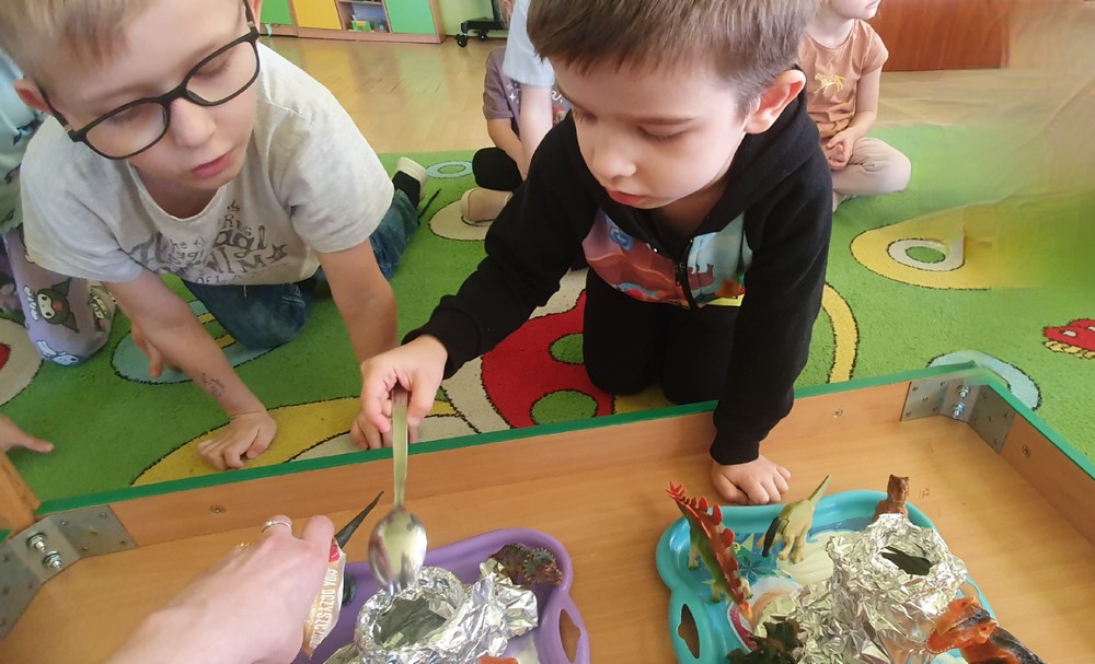 Najwięcej emocji wzbudziła zabawa, podczas której dzieci zamieniły się w prawdziwych paleontologów. W różnych zakątkach sali ukryte były skamieliny, które należało odnaleźć. Każde odkrycie dzieci zaznaczały na specjalnej liście, niczym prawdziwi badacze.