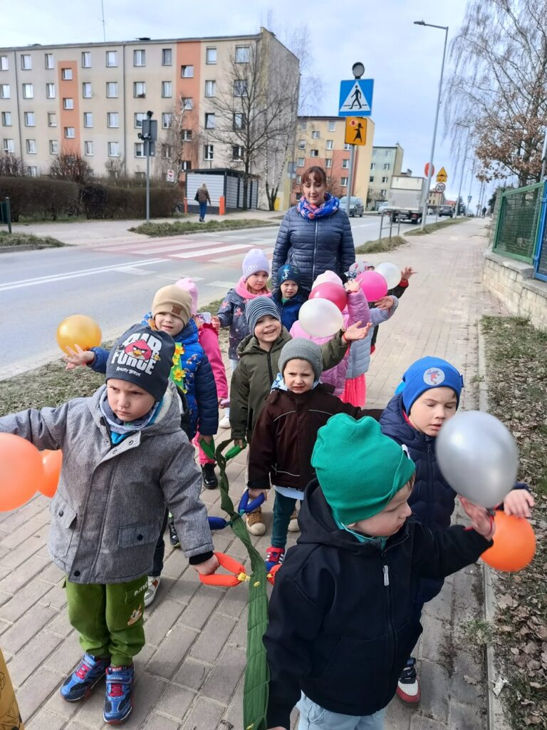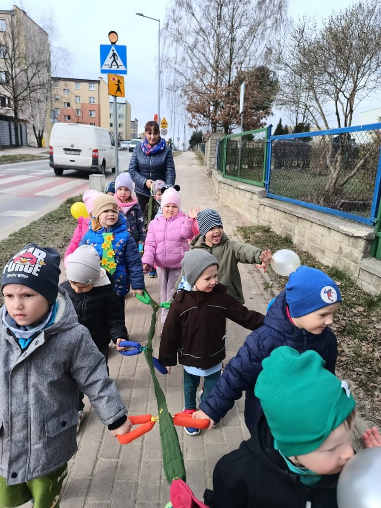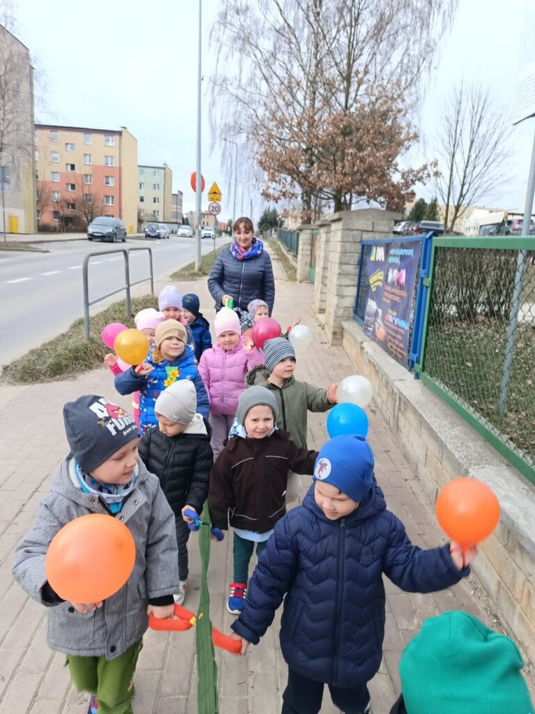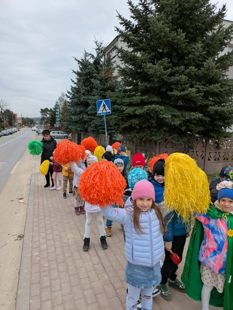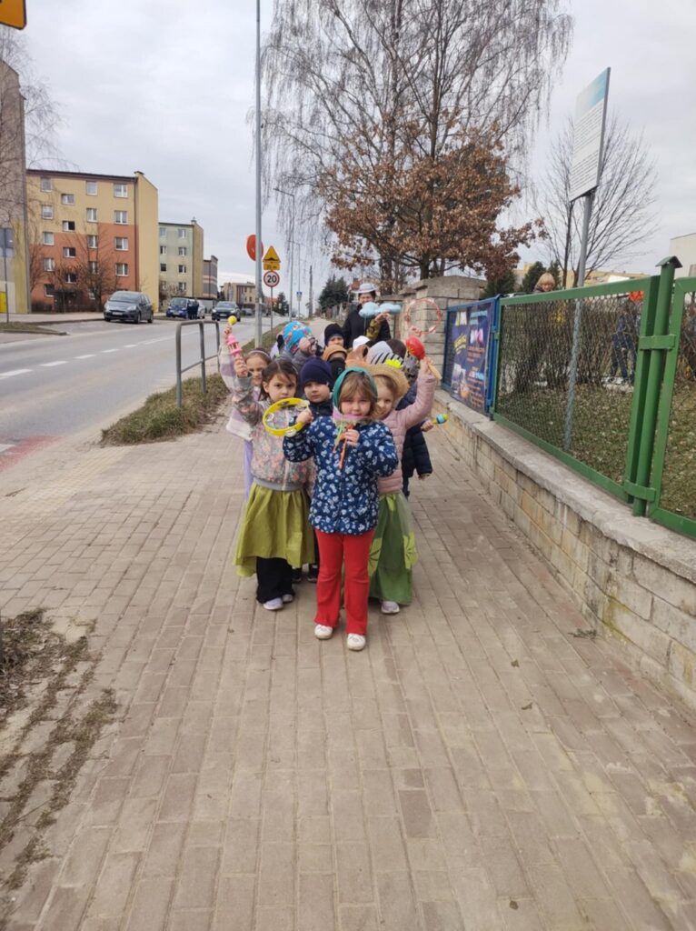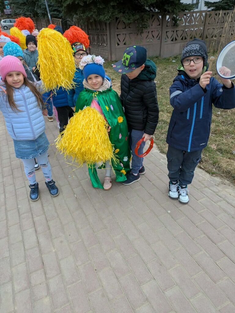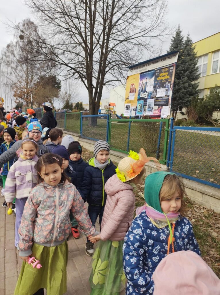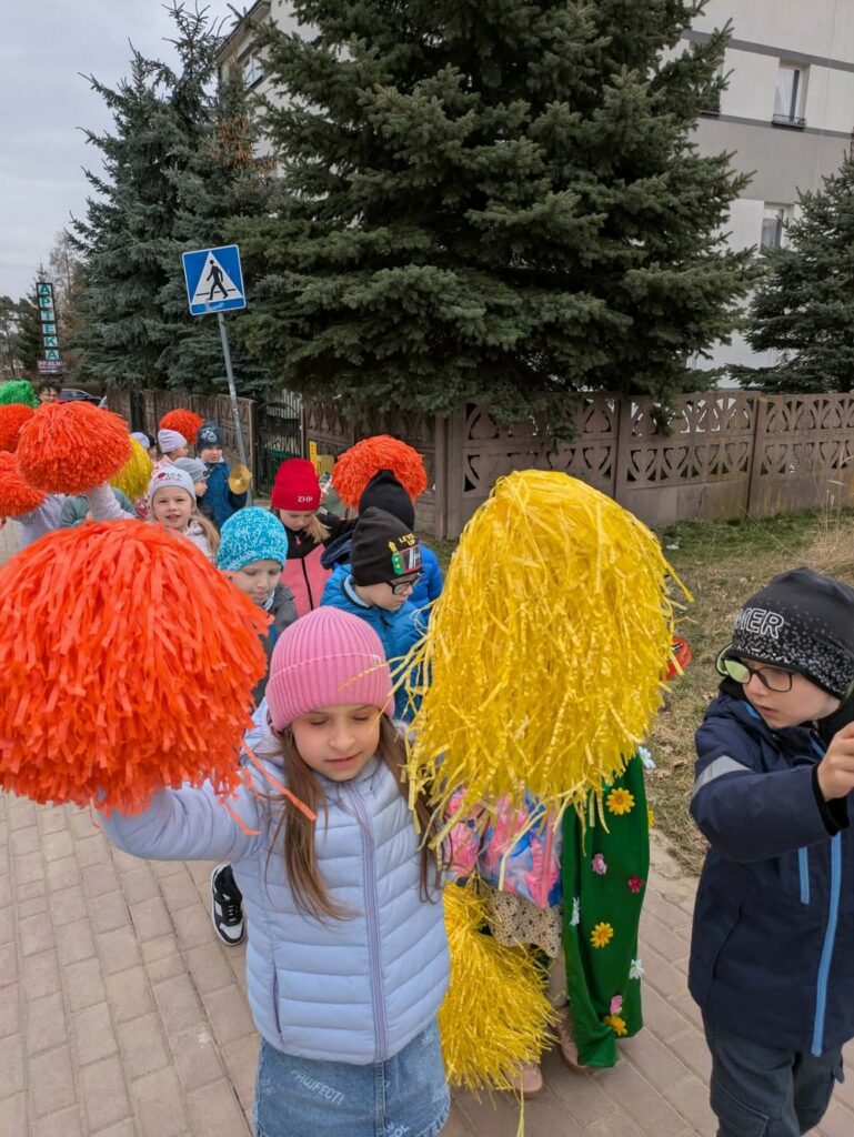 Podczas wspólnej wędrówki obserwowały pierwsze oznaki wiosny – kwitnące kwiaty, zielone pąki na drzewach oraz śpiew ptaków. Był to czas radości, ruchu na świeżym powietrzu i odkrywania budzącej się do życia przyrody. Powitaniu wiosny towarzyszyły również kolorowe stroje, instrumenty oraz wesołe piosenki przywołujące wiosnę.