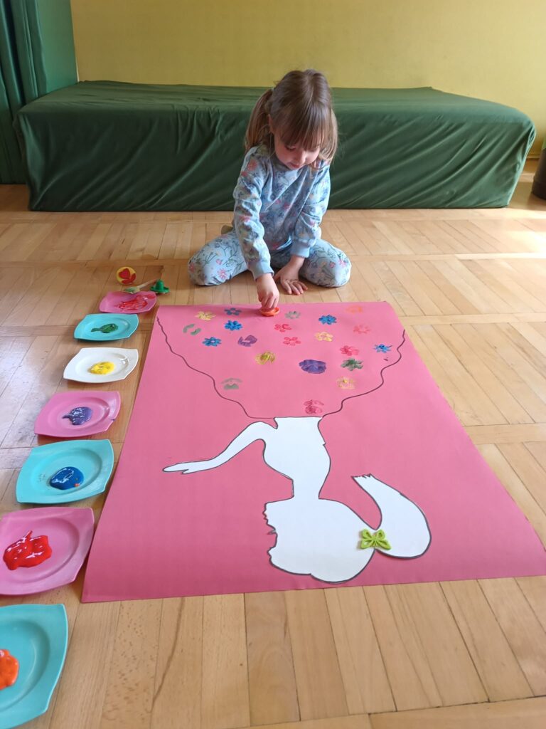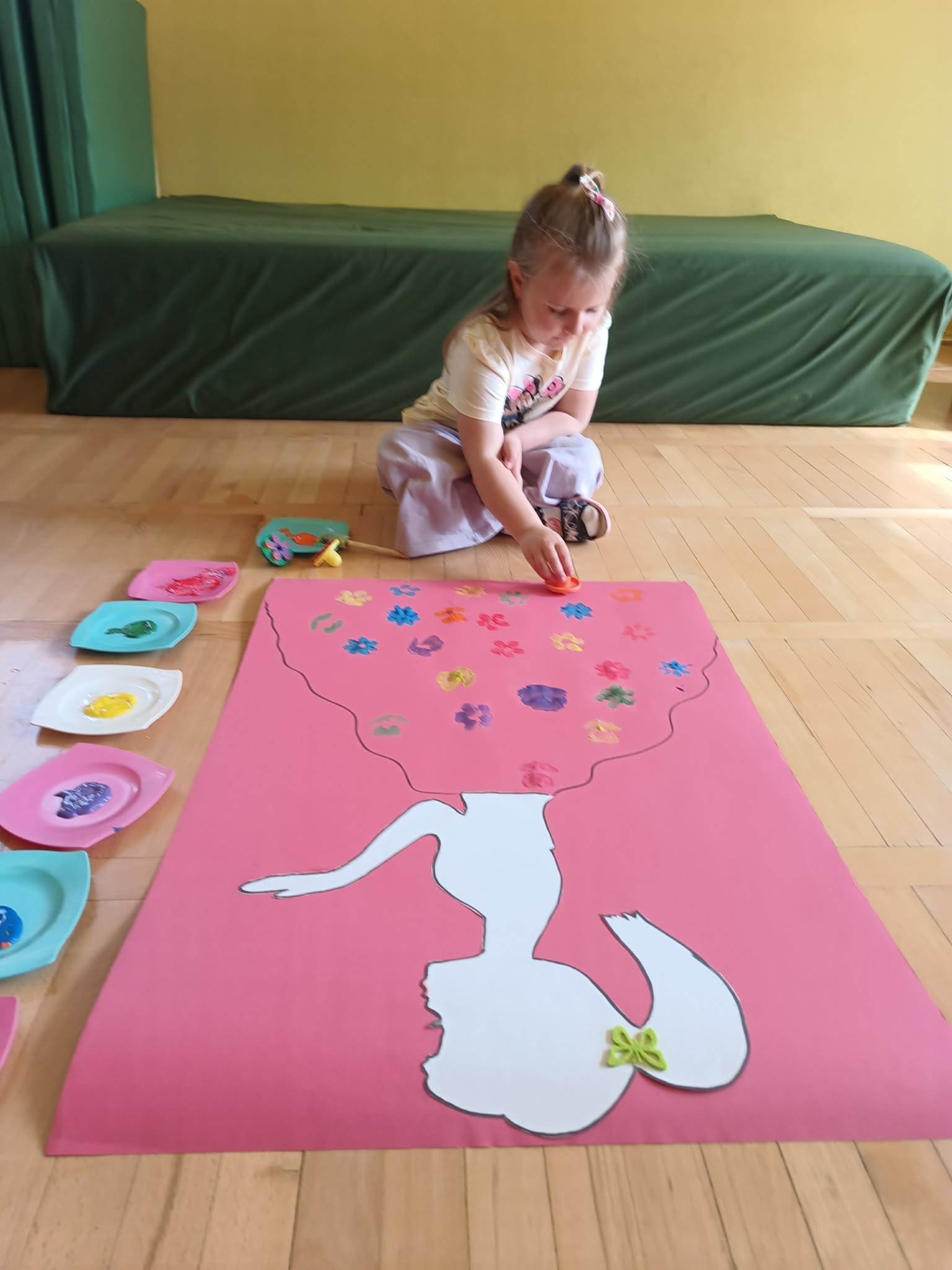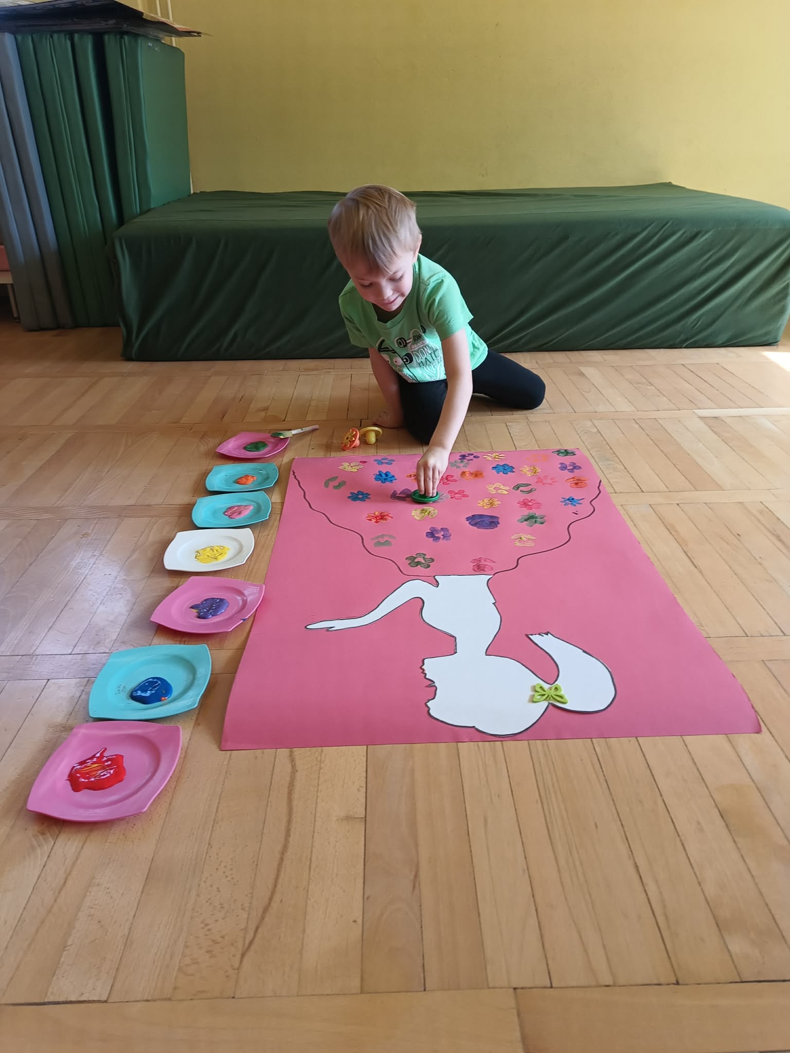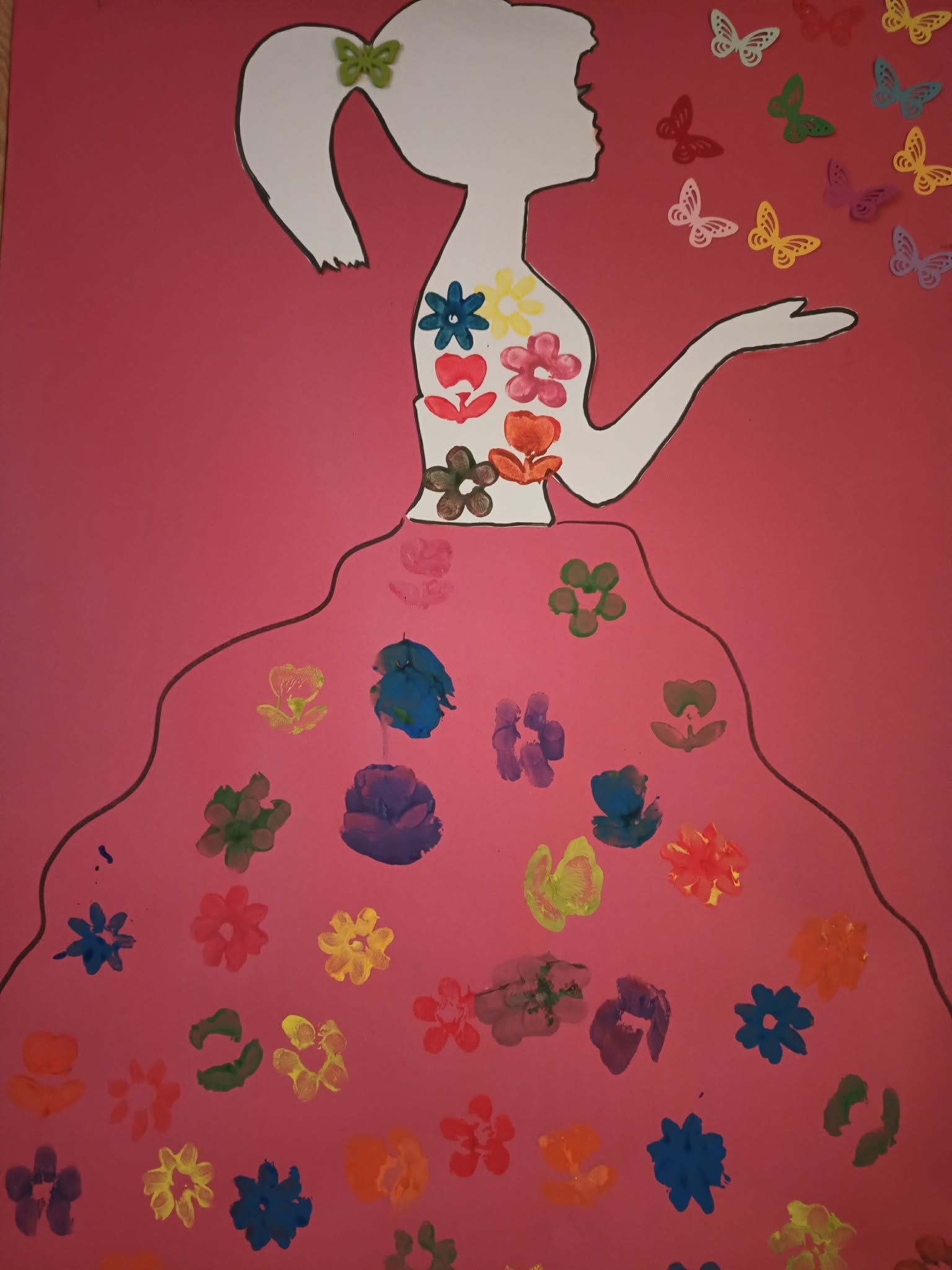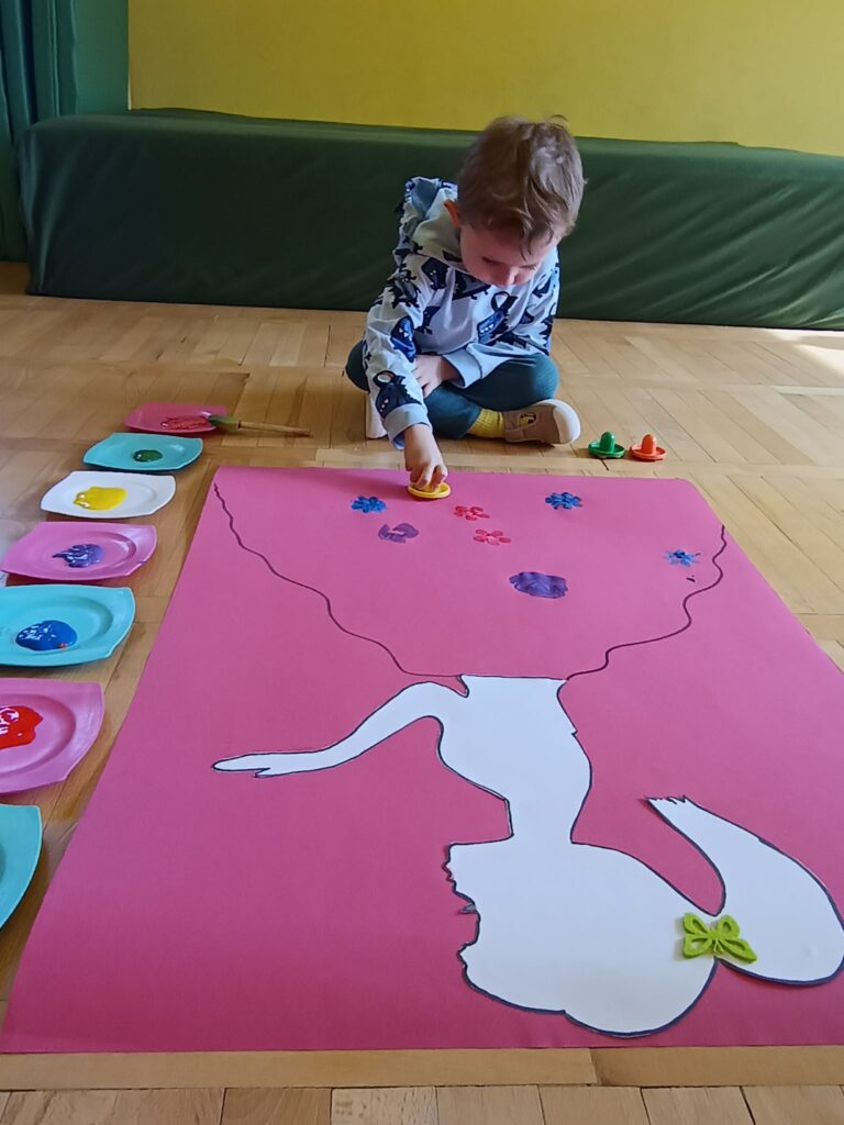 Praca plastyczna „Pani Wiosna” została wykonana przez dzieci z grupy „Słoneczka” przy użyciu farb oraz pieczątek kwiatowych. Dzieci ozdabiały postać Pani Wiosny kolorowymi kwiatami, tworząc je poprzez odbijanie pieczątek zanurzonych w farbie. Dzięki temu powstały barwne, radosne kompozycje, rozwijające kreatywność i sprawność manualną dzieci.