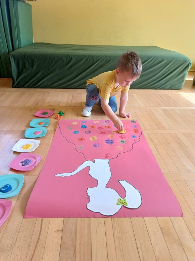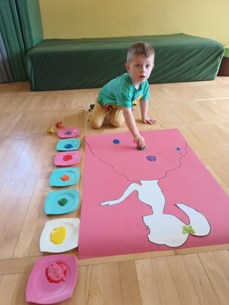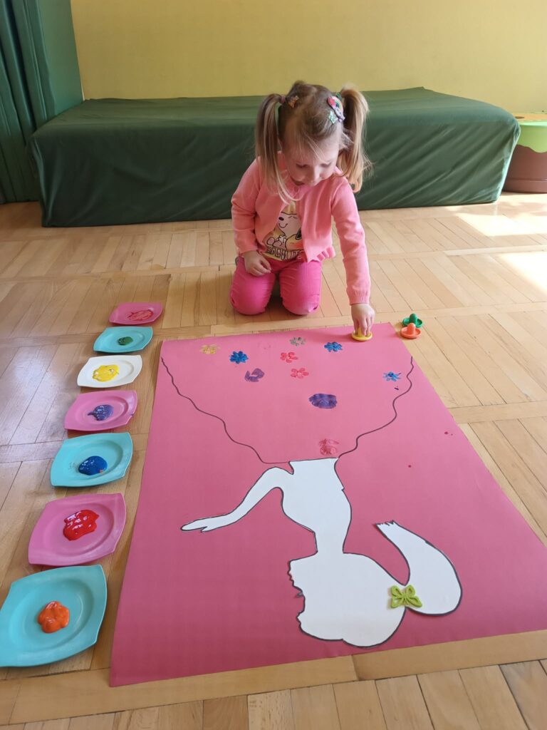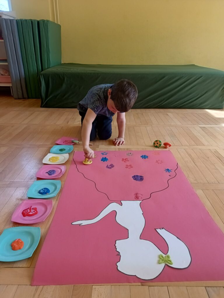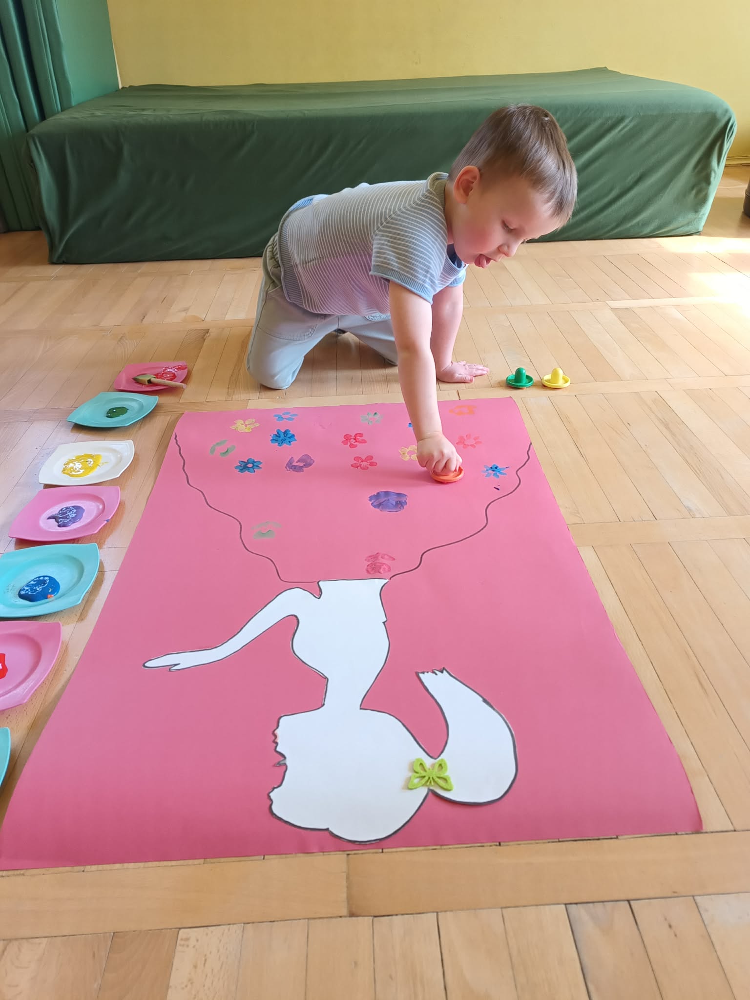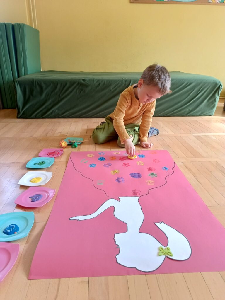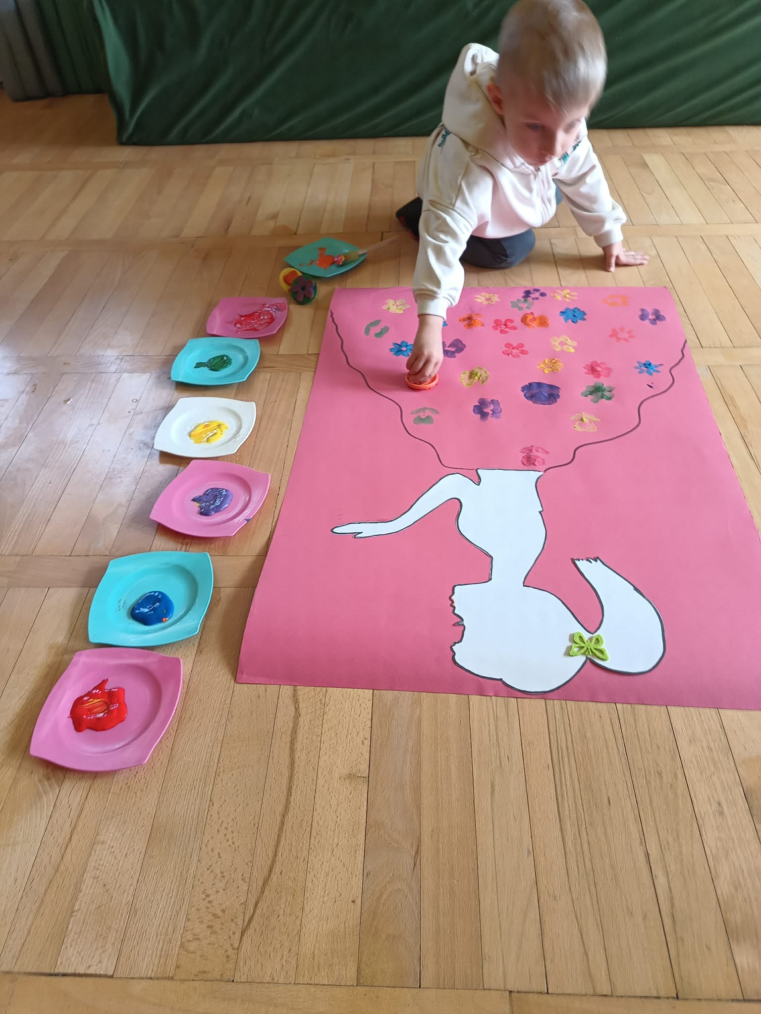 Praca plastyczna „Pani Wiosna” została wykonana przez dzieci z grupy „Słoneczka” przy użyciu farb oraz pieczątek kwiatowych. Dzieci ozdabiały postać Pani Wiosny kolorowymi kwiatami, tworząc je poprzez odbijanie pieczątek zanurzonych w farbie. Dzięki temu powstały barwne, radosne kompozycje, rozwijające kreatywność i sprawność manualną dzieci.