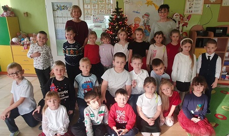 W tym uroczystym dniu Pani Dyrektor Agnieszka Tokarczyk złożyła życzenia wszystkim dzieciom, następnie wszyscy podzielili się opłatkiem i zasiedli do wigilijnego stołu, a na koniec śpiewali kolędy.